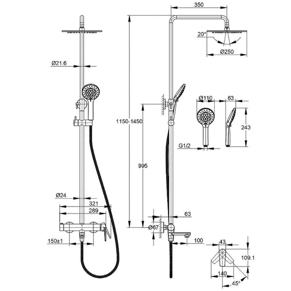 | Диаметр верхнего душа, мм | 250 |