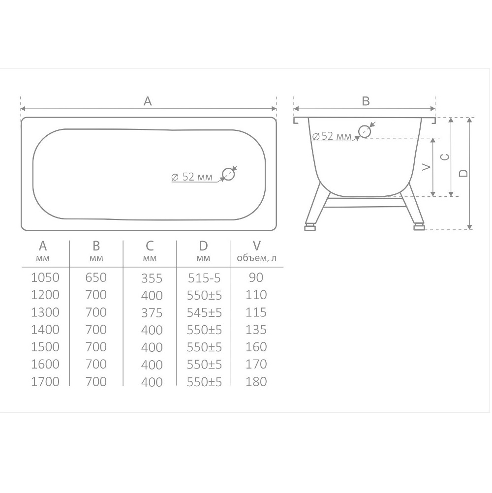 Ванна стальная Виз Antika 150х70 с опорной подставкой Белый глянцевый A-50001